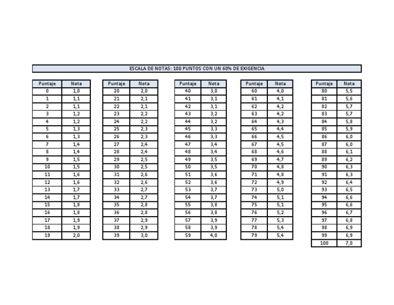Escala de Notas Al 60 Tabla 100 Puntos Define la nota de aprobación que refleje tus criterios y obtén una tabla de puntajes y calificaciones a medida. Puntos obtenidos entre total de puntos, por cuatro, más uno. Ajusta el nivel de exigencia al 60 u otro valor, la nota de aprobación, y obtén una tabla de notas y. Obtén tablas para diferentes niveles de exigencia, puntajes, etc. Generador. Tabla 100 Puntos.