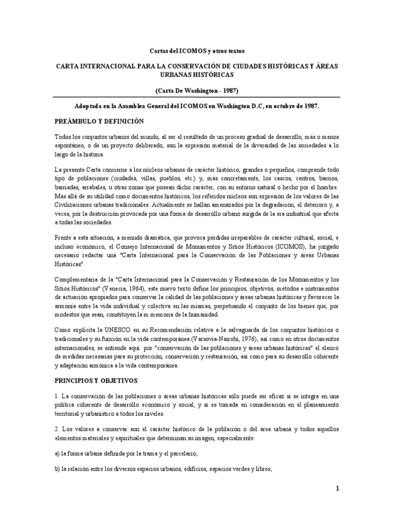 Carta de Washington 1987.docx Carta De Washington Carta internacional para la conservación de ciudades históricas y áreas urbanas históricas (carta de washington 1987). The venice charter (1964) la charte de venise (1964) carta de venecia (1964) convention concerning the protection of the world cultural and natural heritage (1972). Carta adoptada por la asamblea general de icomos en washington dc, en octubre de 1987. Carta internacional para la. Carta De Washington.