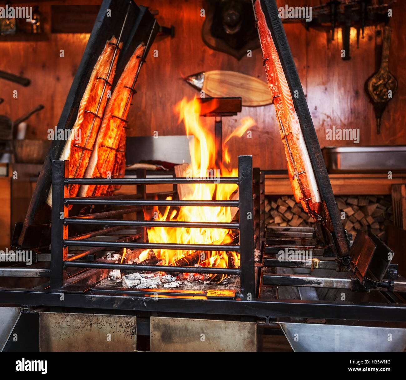 Grilled salmon fish on open fire Stock Photo Alamy