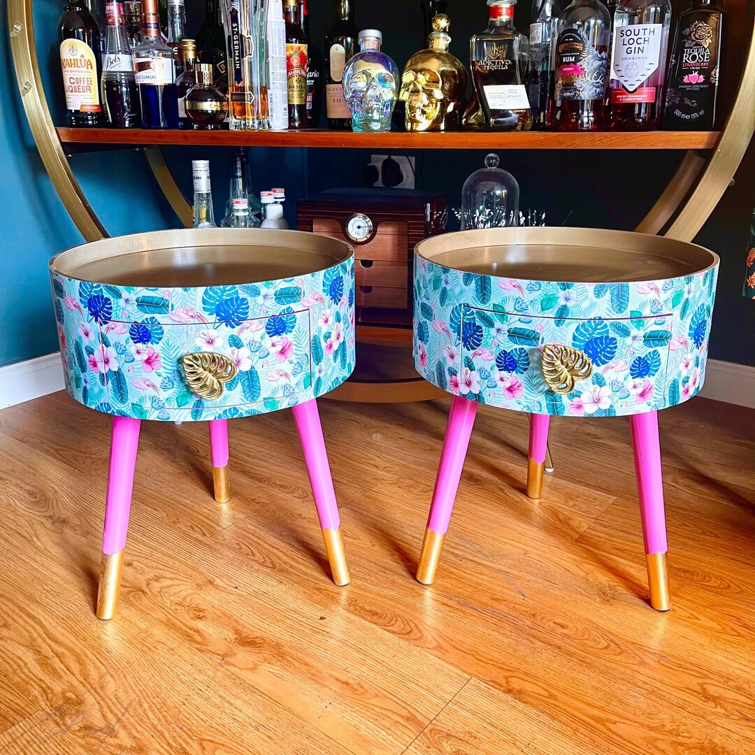 Pair of Bedside Tables, Blue and Mint Tropical Flamingo Pink Nightstand