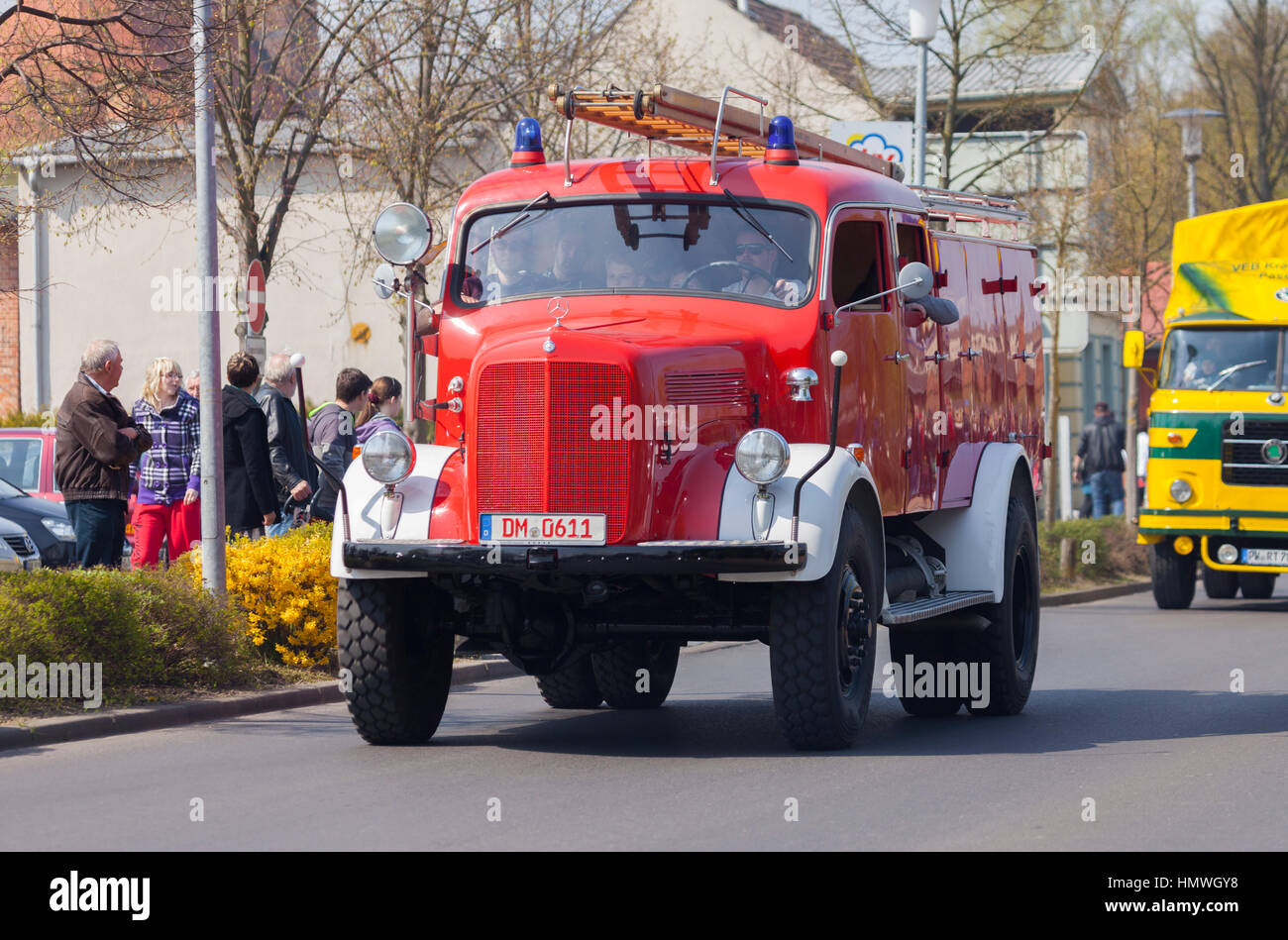 ALTENTREPTOW / GERMANY MAY 1, 2016 german mercedes benz fire truck oldtimer drives on a