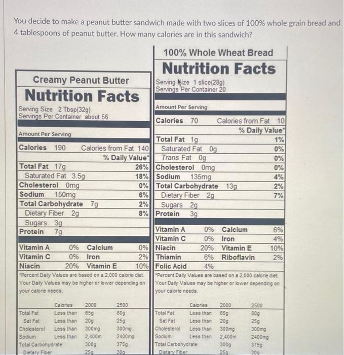 Solved You decide to make a peanut butter sandwich made with Peanut Butter Sandwich Nutrition Get full nutrition facts and other common serving sizes of peanut butter sandwich including 100 g. A donut chart showing which nutrients contribute to the caloric total. The macronutrient breakdown is 39% carbs, 48% fat,. There are 342 calories in 1 peanut butter sandwich. Get full nutrition facts and other common serving sizes of peanut butter. Find out how many. Peanut Butter Sandwich Nutrition.
