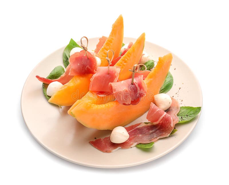 Delicious Melon with Prosciutto and Mozzarella Cheese on White