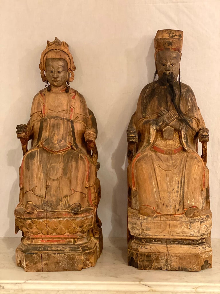 19th Century Antique Chinese Statues of Emperor and Empress in Wood For
