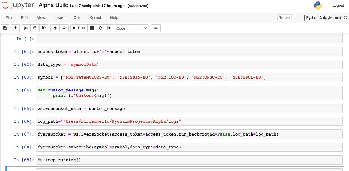 Fyers websocket unresponsive, custom_message not triggered Fyers Api socket This project allows you to connect to fyer's trading api. Fyers api v3 maintains most of the existing structures for backward compatibility but introduces notable changes in the websocket. Improved tick update speed, ensuring swift and efficient market data updates. From fyers_api.websocket import ws def run_process_foreground_symbol_data (access_token): What is the websocket urls for implementing websockets using other languages in rest. Fyers Api socket.