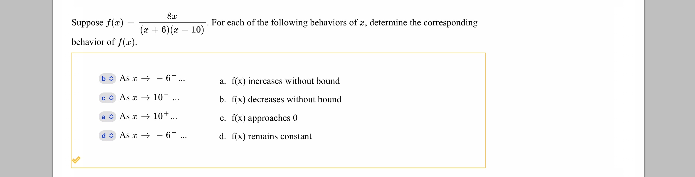 Solved Suppose f(x)=(x+6)(x−10)8x. For each of the following