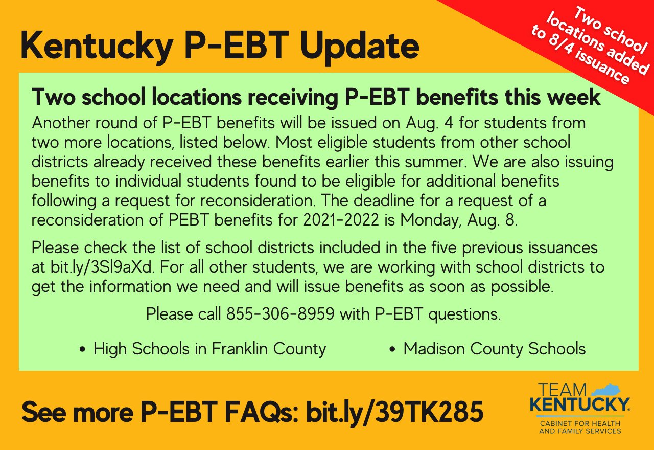 Kentucky Department for Community Based Services on Twitter "PEBT Ebt For Ky Students Federal assistance program designed to address the issue of food. Kentucky is one of 35 states that opted into a new federal program that will give families already receiving food stamp benefits an extra $40 per child each month this summer. The program aims to provide additional nutritional support to eligible students who have received snap, ktap, and/or kinship care. Ebt For Ky Students.