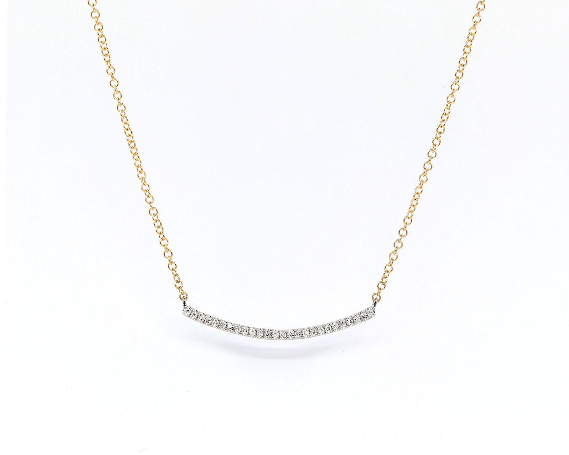 Curved Diamond Bar Necklace 14k Solid Gold Dainty Chain Etsy Diamond Curved Bar Necklace this 14k gold necklace features five diamonds arranged on a curved bar. an elegant necklace showcasing 33 brilliant diamonds set on a curved bar. this 14k white gold necklace features five diamonds arranged on a curved bar. introducing the curved diamond bar necklace from mint & lily, a symphony of elegance and modern sophistication. free. Diamond Curved Bar Necklace.