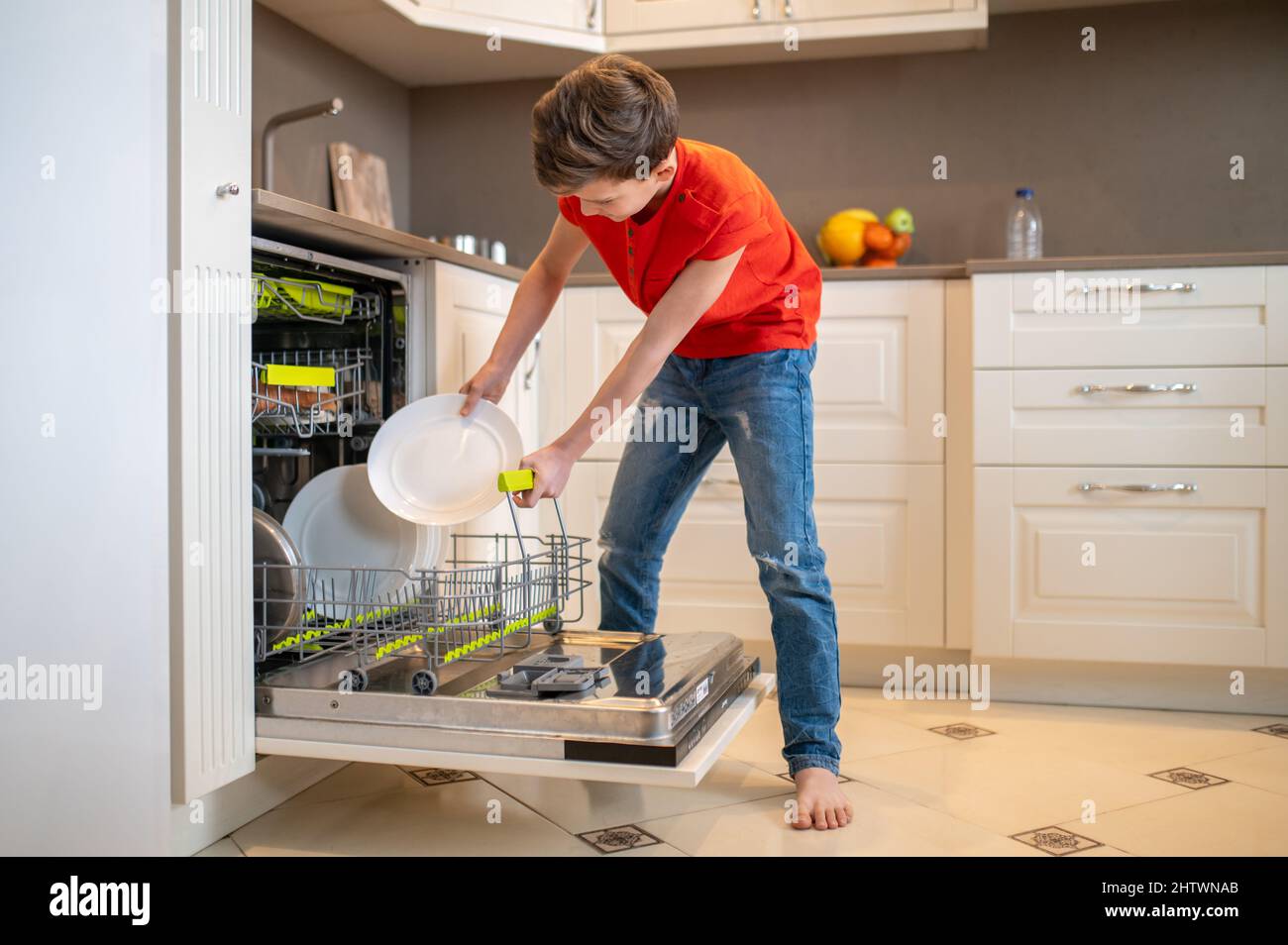 Boy putting dishes into an open dishwashing machine Stock Photo Alamy