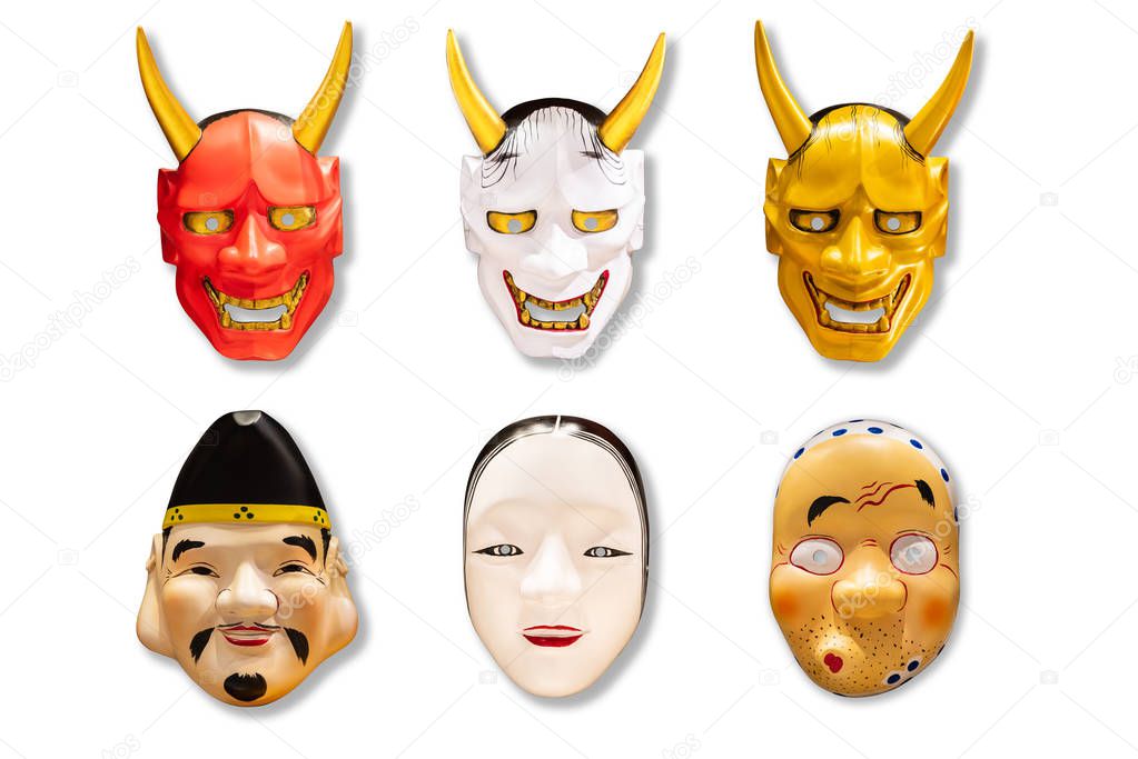 Colección de máscaras tradicionales japonesas rojas, blancas y doradas Kabuki Máscara sobre