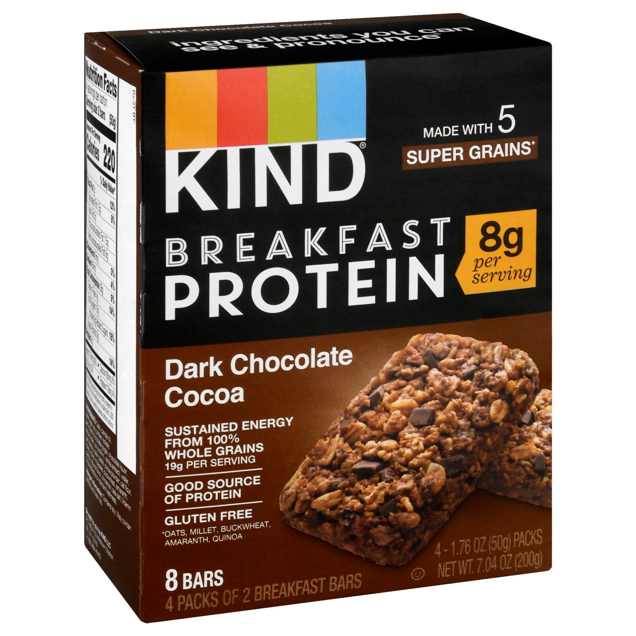 KIND Breakfast Protein Bars, Dark Chocolate Cocoa, Gluten Free, 1.76oz, 4 Protein Bars Kind Breakfast Protein Bars Dark Chocolate Cocoa Kind breakfast bars have a unique blend of super grains and provide at least 19g of whole grains per serving. Kind dark chocolate cocoa breakfast protein bars are made with five super grains—oats, buckwheat, millet, amaranth and quinoa—and baked with the taste of dark chocolate and cocoa for a chewy, soft baked addition to your breakfast. Kind dark chocolate cocoa. Kind Breakfast Protein Bars Dark Chocolate Cocoa.