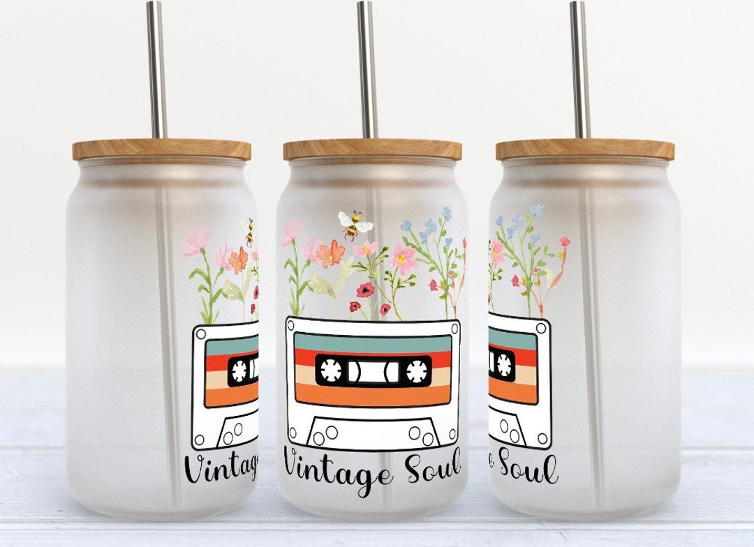 16oz Glass Can Cup, Libby Cup Bamboo Lid Plastic Straw Vintage Soul