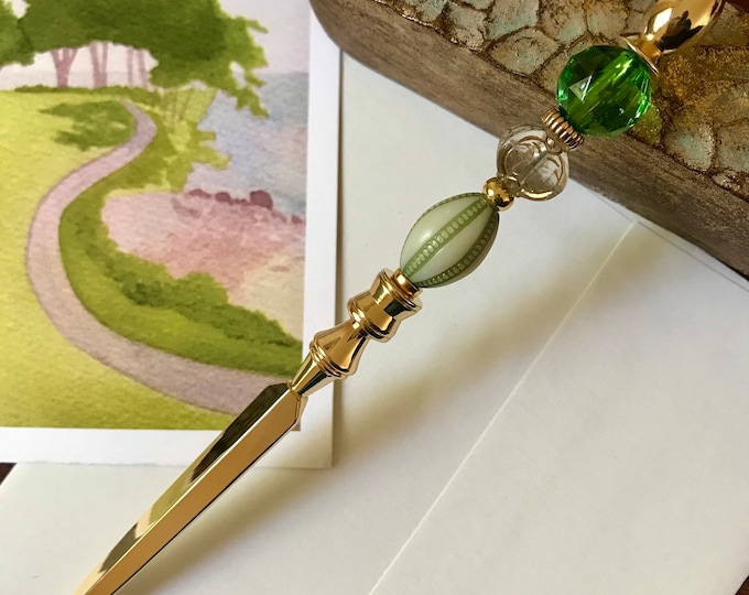 Green Beaded Letter Opener, Gold Letter Opener, Mail Opener, Metal