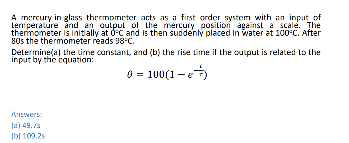 SOLVED A thermocouple which responds as a first order instrument, has A Thermometer Having A Time Constant Of 1 Min Is Initially At 50 A thermometer having a time constant of 1 min is initially at 50 deg c. It is immersed in a bath maintained at 100∘c at t=0. It is immersed in a bath maintained at 100 deg c at t = 0. Using an exponential decay formula, we can calculate the temperature reading at t=1.2 min as follows: It is immersed. A Thermometer Having A Time Constant Of 1 Min Is Initially At 50.