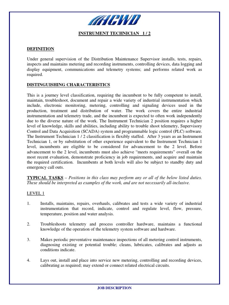 Job Description of Instrumentation Technician Instrumentation Scada
