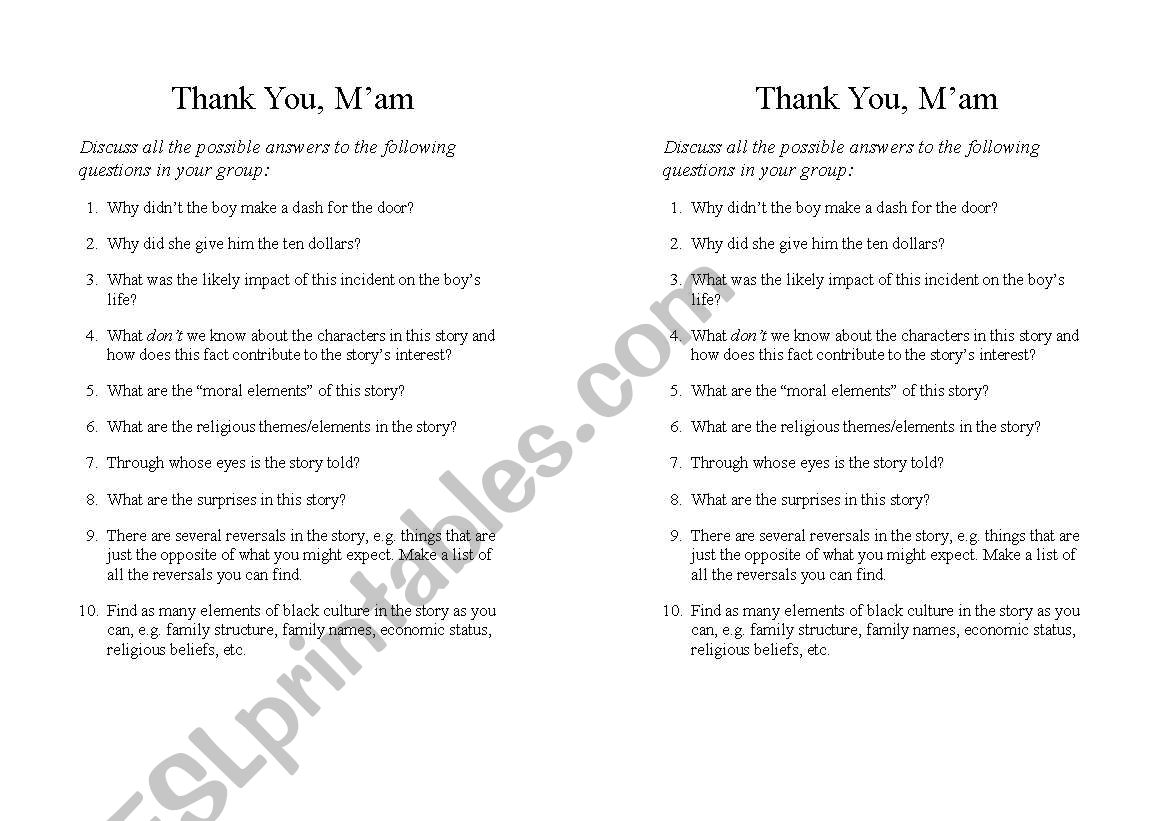 Thank you Ma´am Short Story Discussion Questions ESL worksheet by What Is The Main Theme Of Thank You Ma Am “thank you, ma’am” is a story of surprise from its opening moment of a thwarted robbery. “thank you, m’am” narrates the events of one night for roger, a young boy, and mrs. “thank you ma’am” summary theme of “thank you, ma’am”: Thank you, ma'am study guide contains a biography of langston hughes, literature essays, quiz questions, major themes, characters, and. What Is The Main Theme Of Thank You Ma Am.