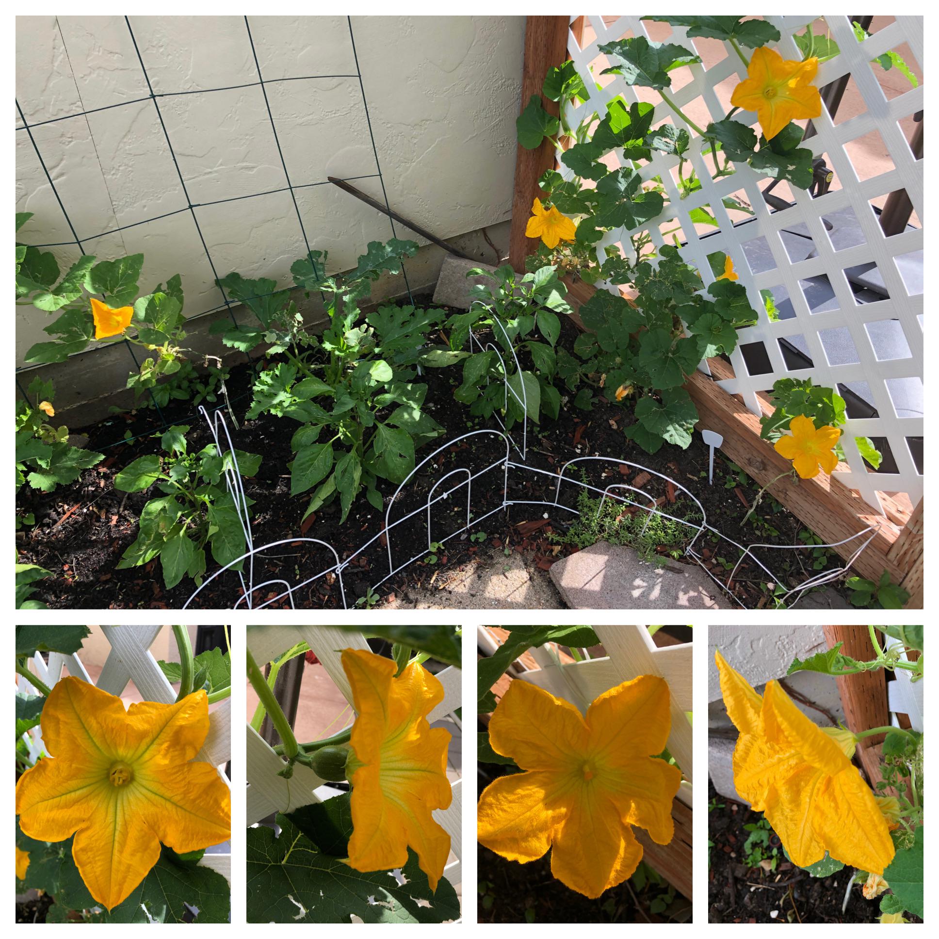 Woke up to a bevy of blossoms! Female pumpkin blossom on the left, male