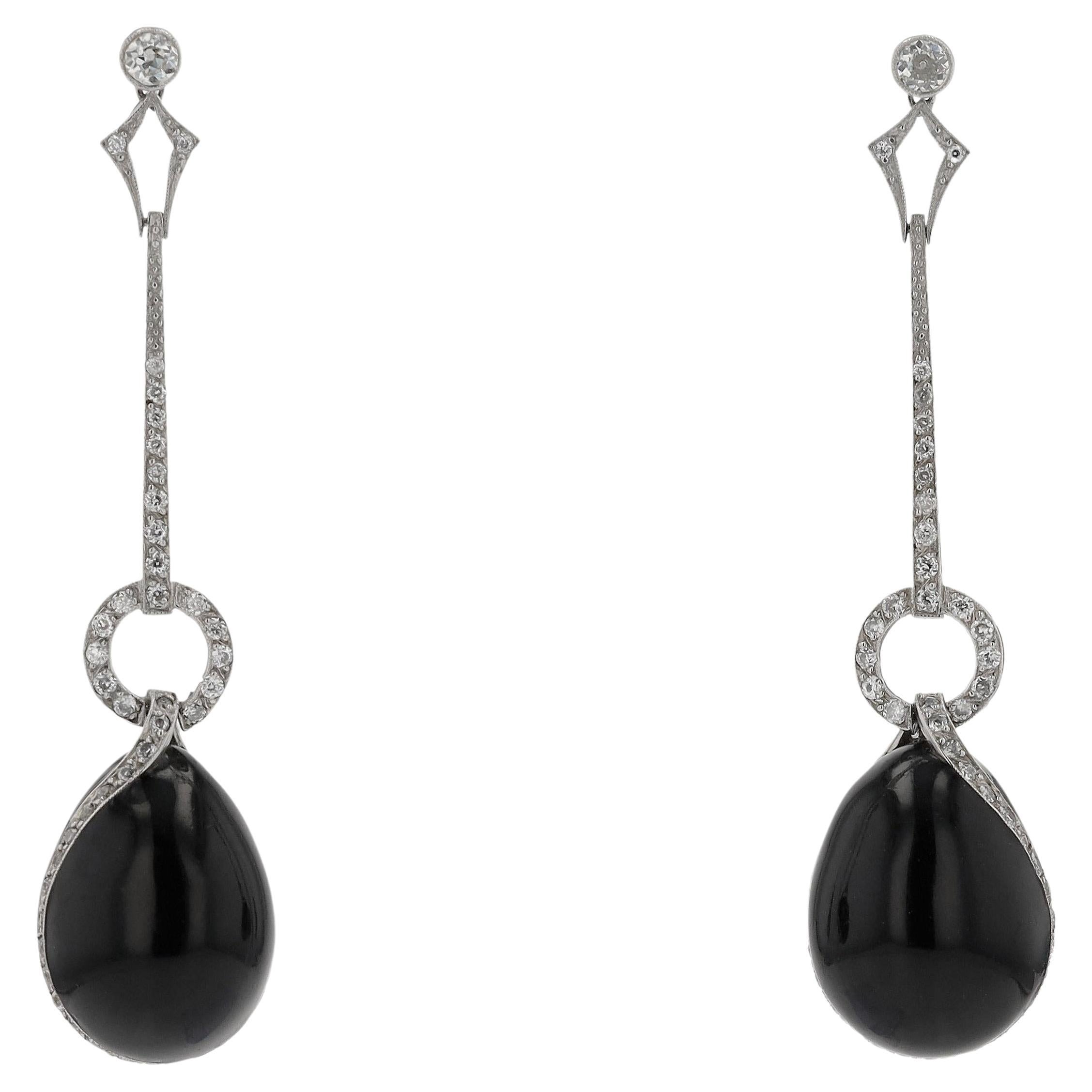 Art Deco Style Onyx Cabs Gold Diamonds Black Enamel Mammoth Bone Drops