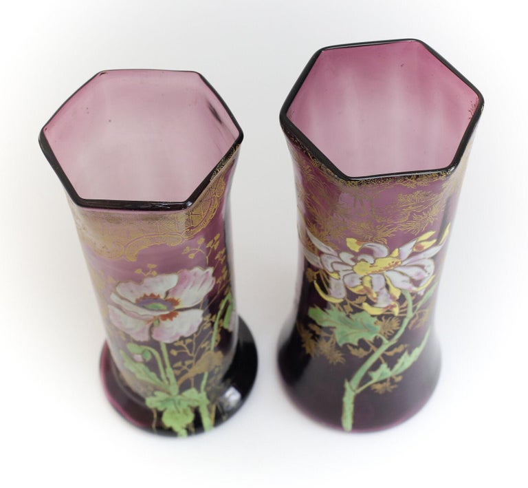Two Mont Joye Amethyst Art Glass Tall Vases Hand Painted Raised Enamel