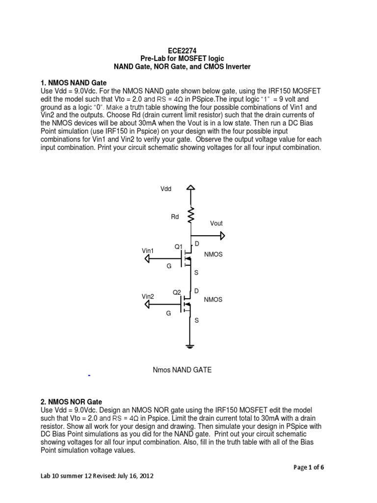ECE2274 PreLab for MOSFET logic NAND Gate, NOR Gate, and CMOS Inverter 1. Nmos Nand Gate