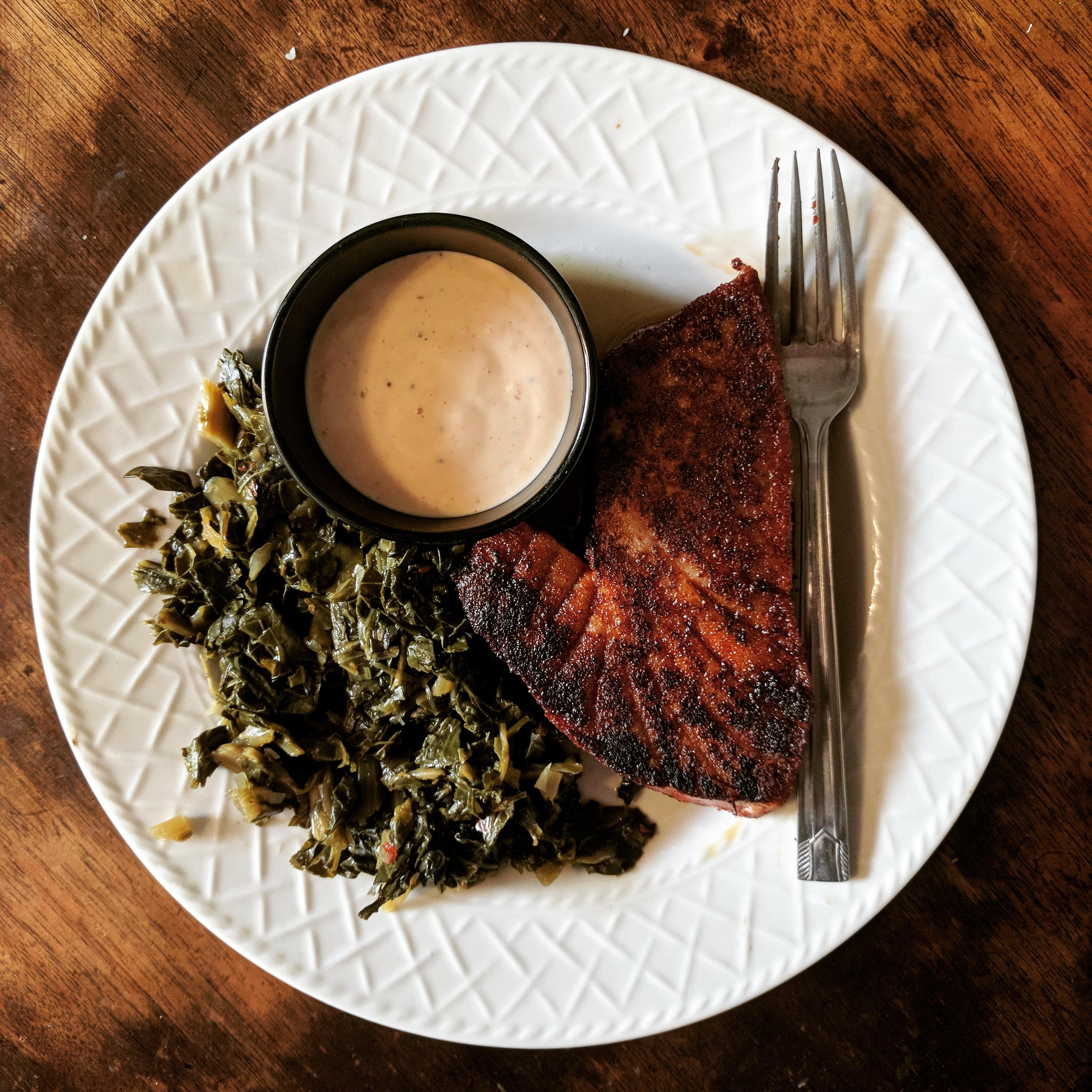 [Homemade] BBQ Crusted Tuna Steak w/ Salvation Sauce and Collards r/food