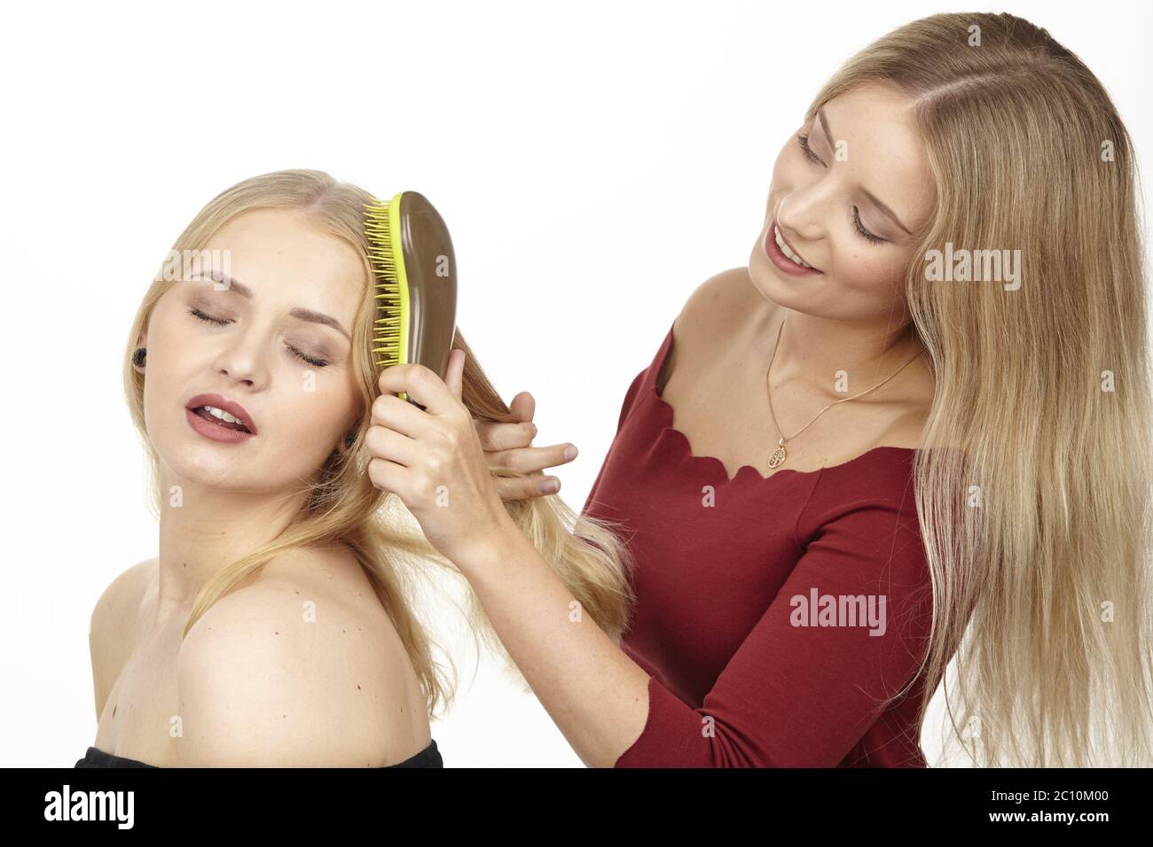 She's doing her friend's hair brushing her hair Stock Photo Alamy
