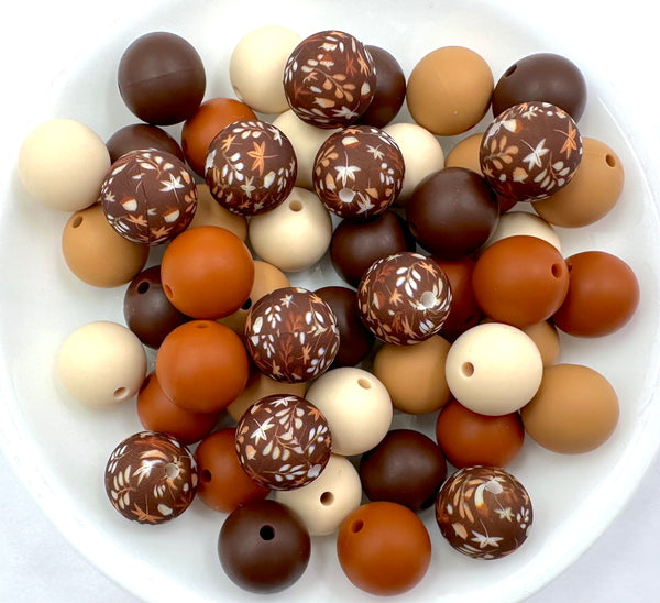 Brown Leaves & Acorn Silicone Bead Mix, Brown, Toasted Coconut, White