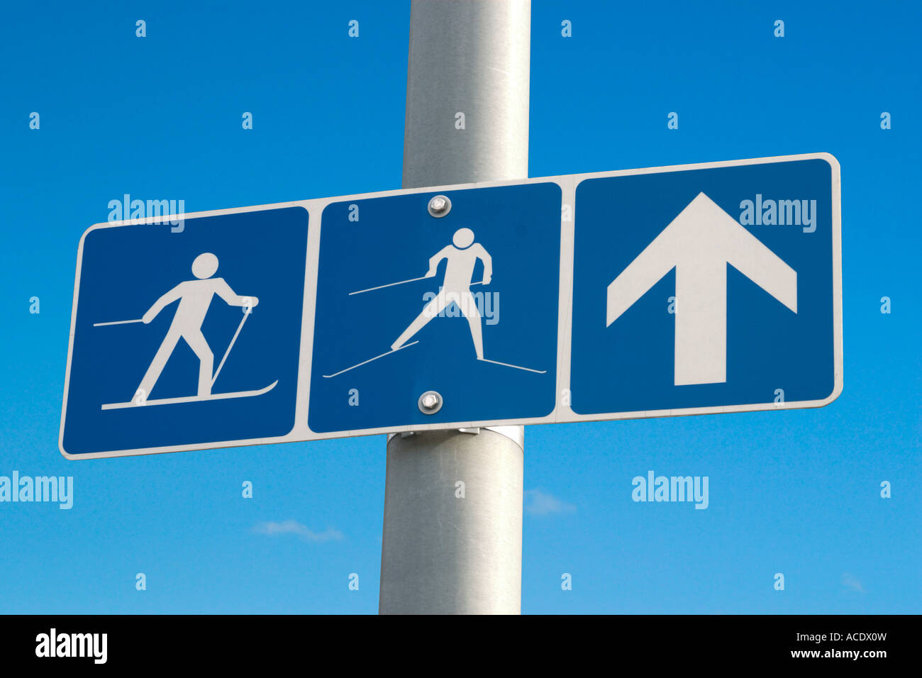 Crosscountry and downhill skiing ahead winter activities sign Stock