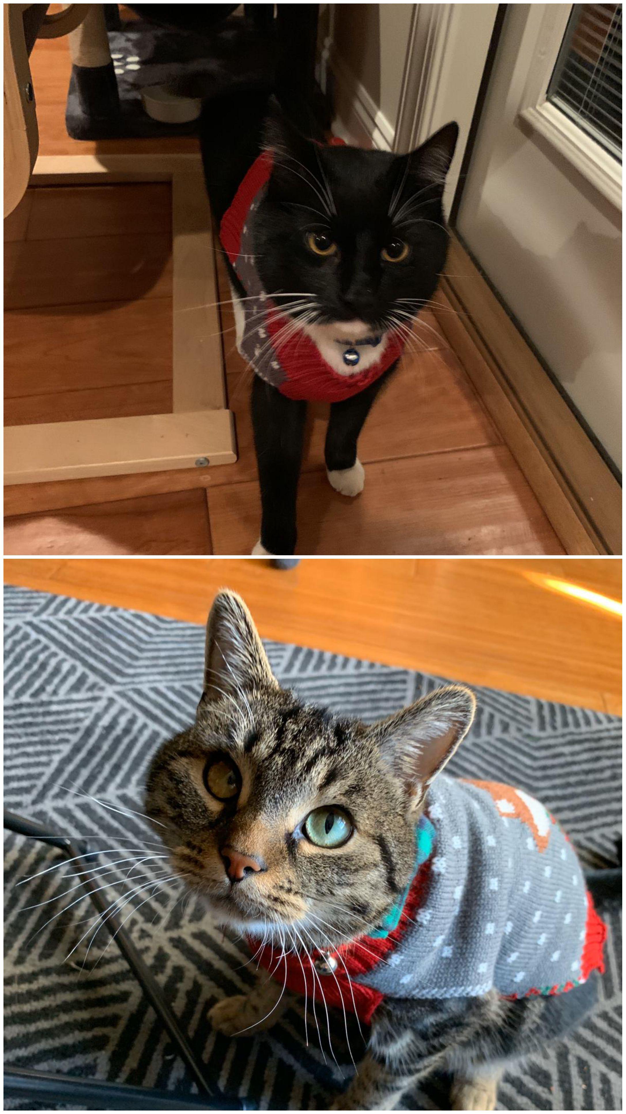 My mom decided to get Christmas sweaters for my cats r/catsincostumes