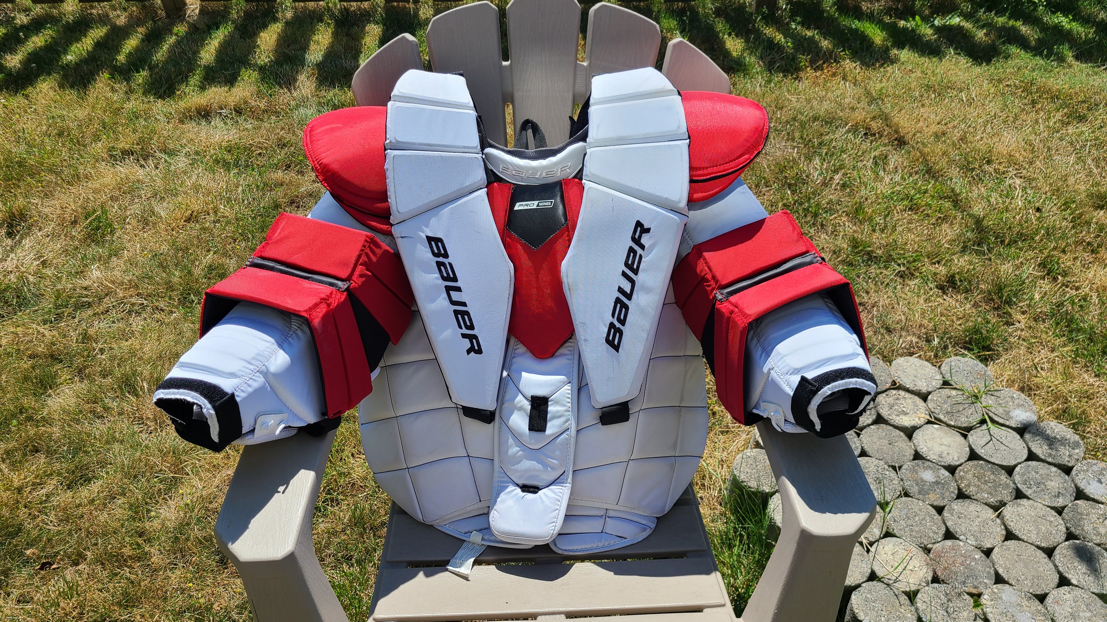 Bauer GSX Prodigy Youth Goalie Chest & Arm Protector Bauer Pro Goalie Chest Protector The chest area has several layers of hd lightweight hd foam that creates the barrier from puck to body. Bauer's pro series chest & arm is extra strong to give the goalie extra protection and feel safe between the poles. Featuring reinforced pads and powerlite technology through the shoulder floaters. Lightweight material and an updated belly wrap fit and gear.. Bauer Pro Goalie Chest Protector.