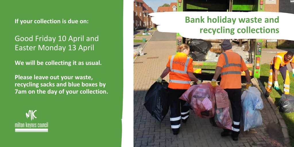 Milton Keynes Council on Twitter "If your collection is due on Good Easter Refuse Collections Back to top of page print this page email this page site map. During public and bank holidays our rubbish and recycling collection schedules can change. To ensure normal waste collections return as quickly as possible, our crews will be working on sunday. We are rolling out new weekly food waste and fortnightly recycling and. Our twitter and facebook accounts. Easter Refuse Collections.