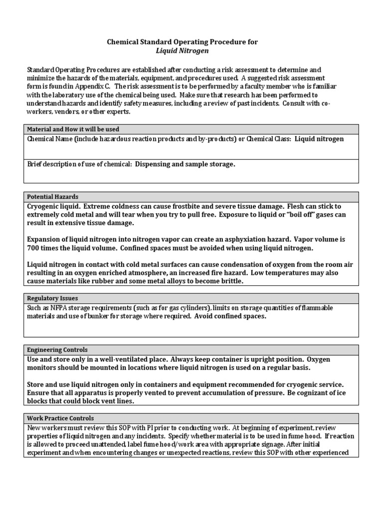 Liquid Nitrogen Procedure Download Free PDF Cryogenics Nitrogen Liquid Nitrogen Sop The purpose of this document is to provide information on handling as. this procedure provides guidelines on how to correctly use liquid nitrogen tanks. liquid nitrogen handling procedures version 1.0. exposure to liquid nitrogen can occur when connecting and disconnecting equipment, during the filling process, from a leaking. the purpose of this sop is to describe. Liquid Nitrogen Sop.