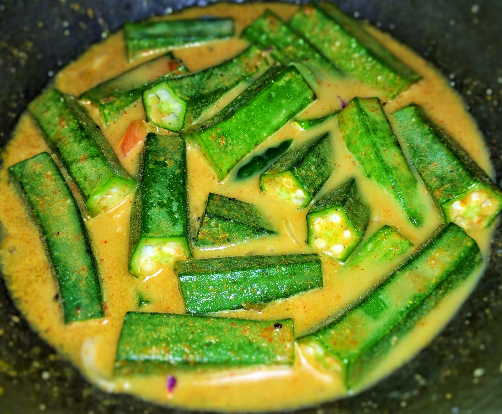 Kitchen Simmer Okra Curry with Coconut Milk (Throwback Thursday) Okra Curry With Coconut Milk Add 2 tsp of canola oil into a pan and add the onions, chilies, curry leaves, cinnamon stick, fenugreek seeds, cumin seeds, mustard seeds, fry for a few minutes until onions begin to soften. Then add the okra into the pan and add the ground spices, red chili powder, turmeric,sugar, salt and curry powder. okra in coconut milk (bhindi. Okra Curry With Coconut Milk.