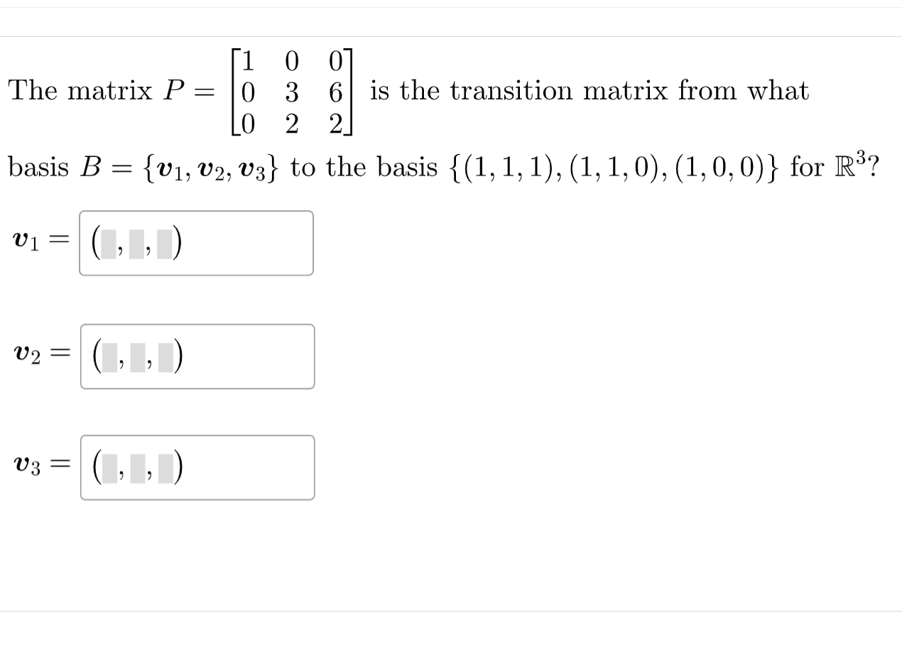 Solved The matrix P=⎣⎡100032062⎦⎤ is the transition matrix What Is The Transition Matrix From Basis X = sy y = s − 1x. We have the transition matrix \(p_{12}\) from \(b_1\) to \(b_2\) and the. Where s is the transition matrix. The transition matrix p b0 b from. A transition matrix helps find the coordinates of vectors from one basis to another basis. The transition matrix psˆt from t to s is n £ n. What Is The Transition Matrix From Basis.