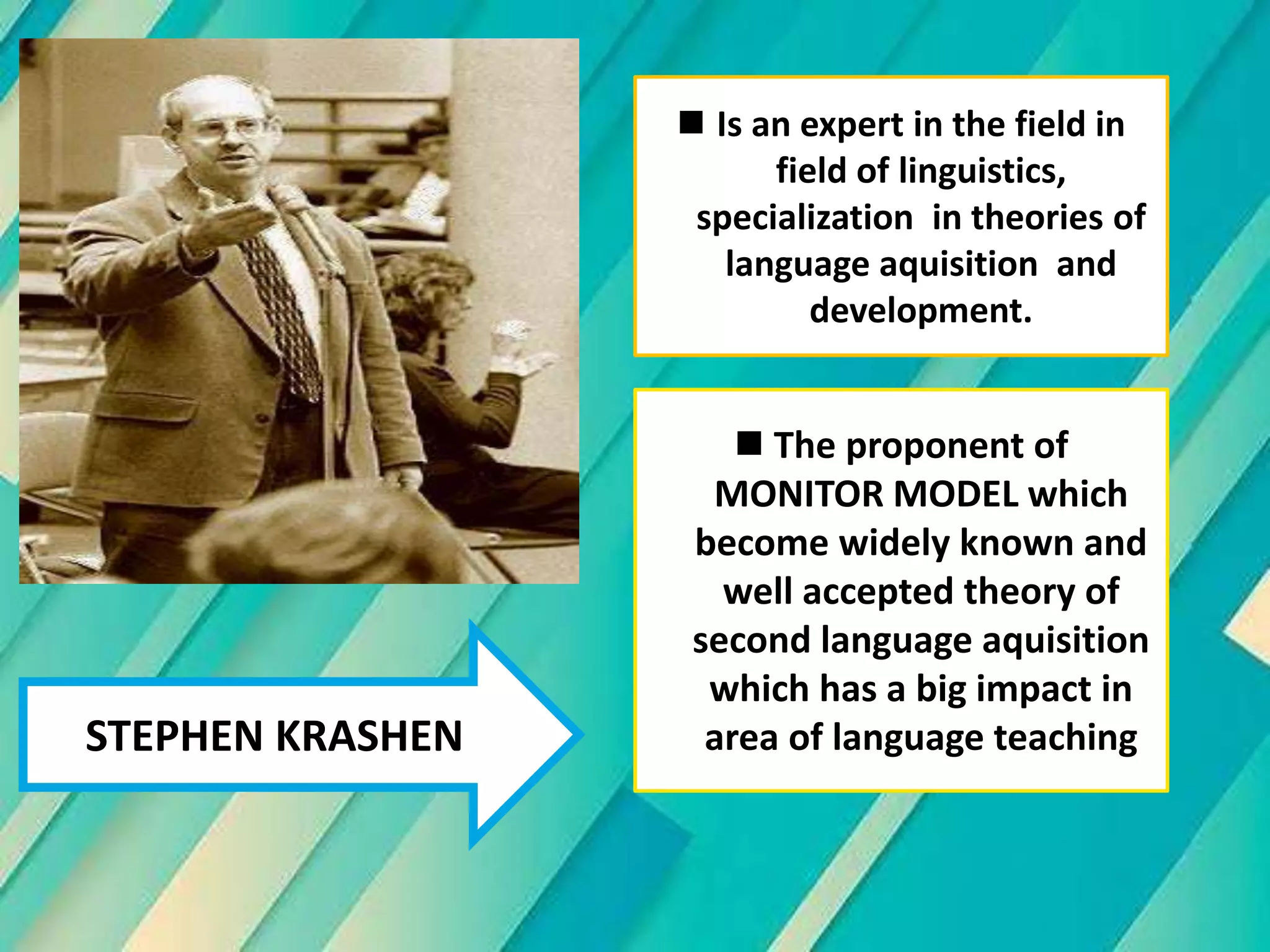 Krashen's Monitor Hypothesis Theory 3 PPT Monitor Model Hypothesis By Krashen Monitor theory hypothesizes that adults have two independent systems for developing ability in second languages, subconscious language acquisition and conscious language learning,. Krashen's monitor theory rests on the following five hypotheses: In the monitor hypothesis, krashen points to the learning process as a system which monitors and analyze our development of this. Stephen krashen is an educator and linguist who. Monitor Model Hypothesis By Krashen.