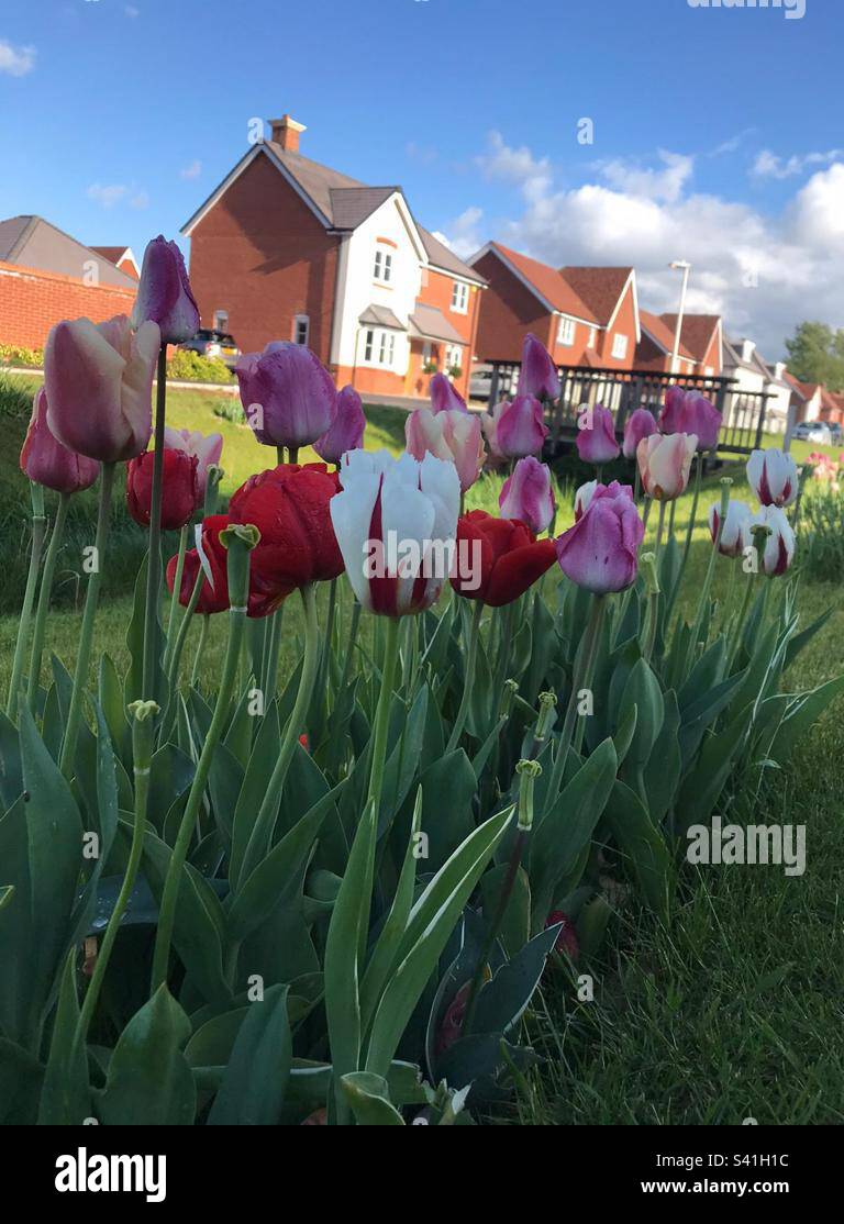 Colourful spring time tulips in front of a new build housing