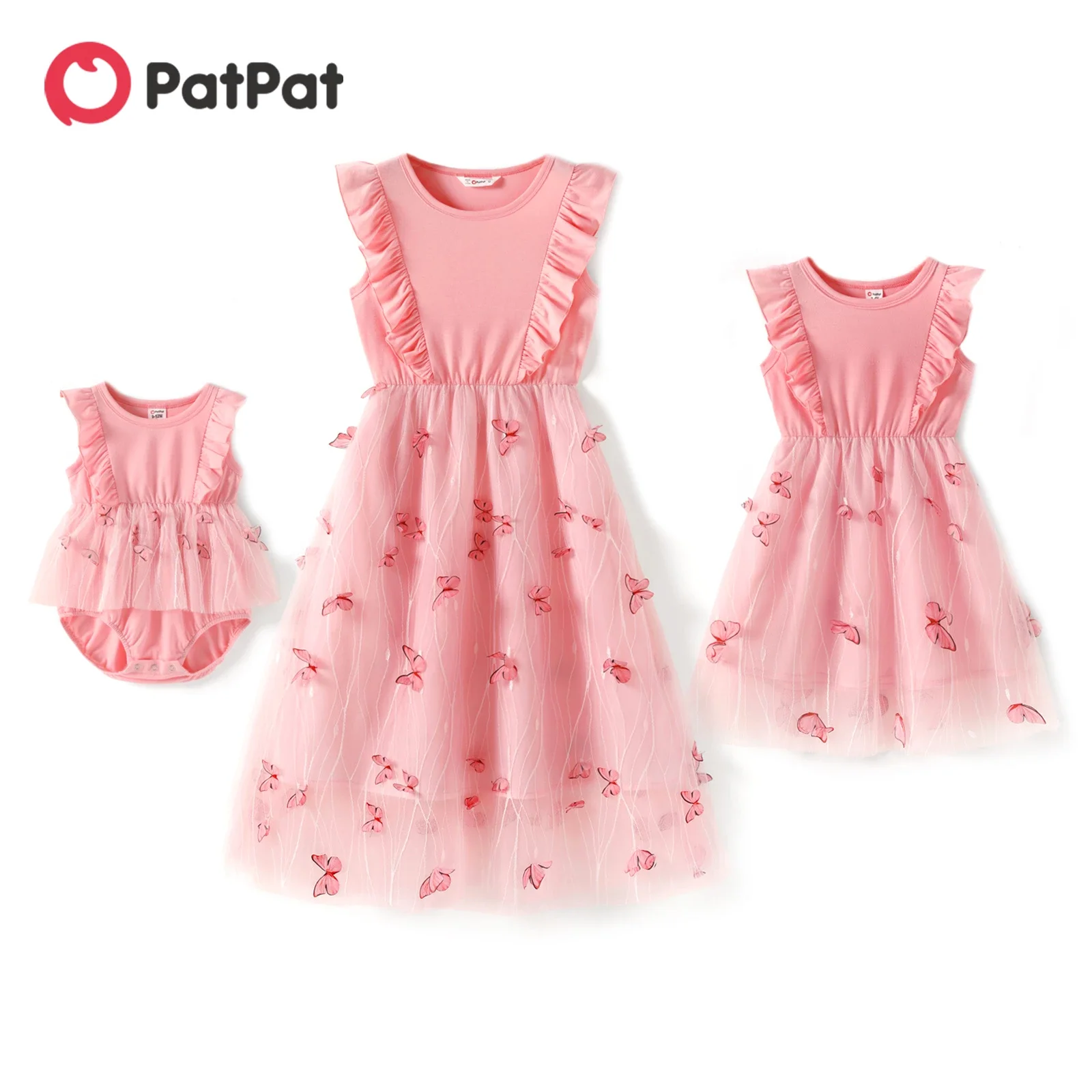 PatPat Dress for Mom and Me Pink Round Neck Ruffle Sleeveless Splicing Butterfly Family Matching