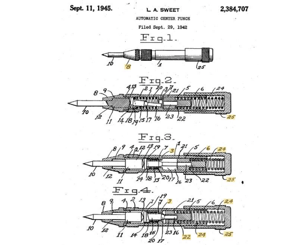 Patent US2384707 Automatic center punch Google Patents Automatic Center Punch Drawing There is a mechanism that automatically forces the. The type of material can be any, but mostly it is the metal sheet. (spring loaded center punch) download files. Usually, they are made of metal. Now i designed a 3d printable automatic center punch. An automatic center punch is referred to as a hand tool which is used in the production. Automatic Center Punch Drawing.