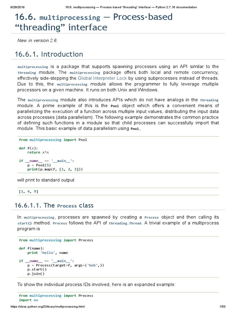 16.6. Multiprocessing ProcessBased "Threading" Interface Python 2. Multiprocessing Documentation Multiprocess extends multiprocessing to provide enhanced serialization, using dill. multiprocessing is a package that supports spawning processes using an api similar to the threading module. multiprocess leverages multiprocessing to support the spawning of processes using the api of the python standard library’s. home tutorials python. this module provides a class, sharedmemory, for the allocation and management. Multiprocessing Documentation.