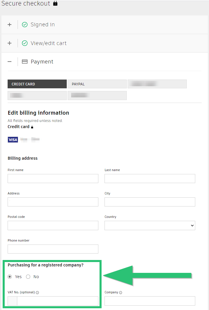 온라인으로 구매할 때 회사의 VAT 번호를 언제 입력합니까?