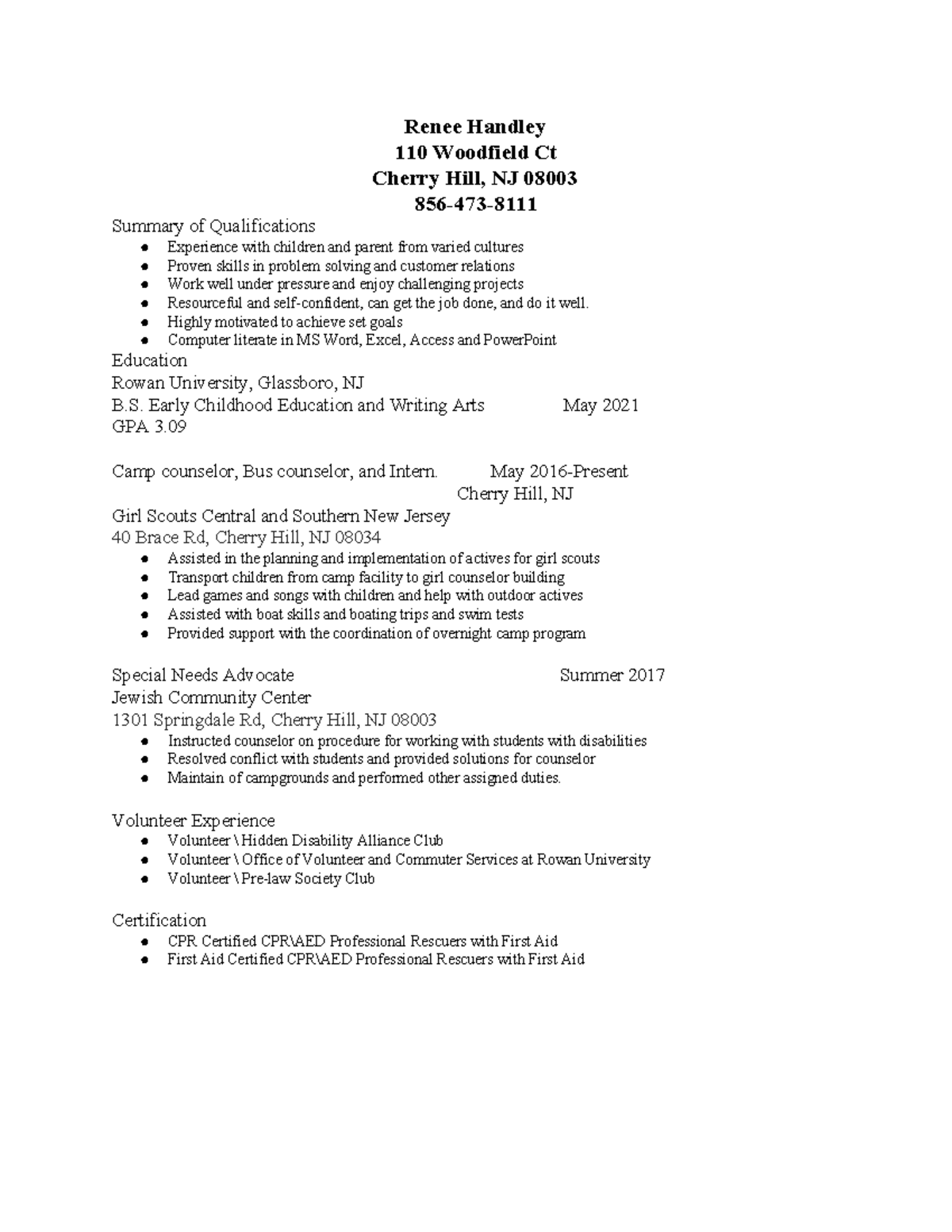 Resume correct Renee Handley 110 Woodfield Ct Cherry Hill, NJ 08003
