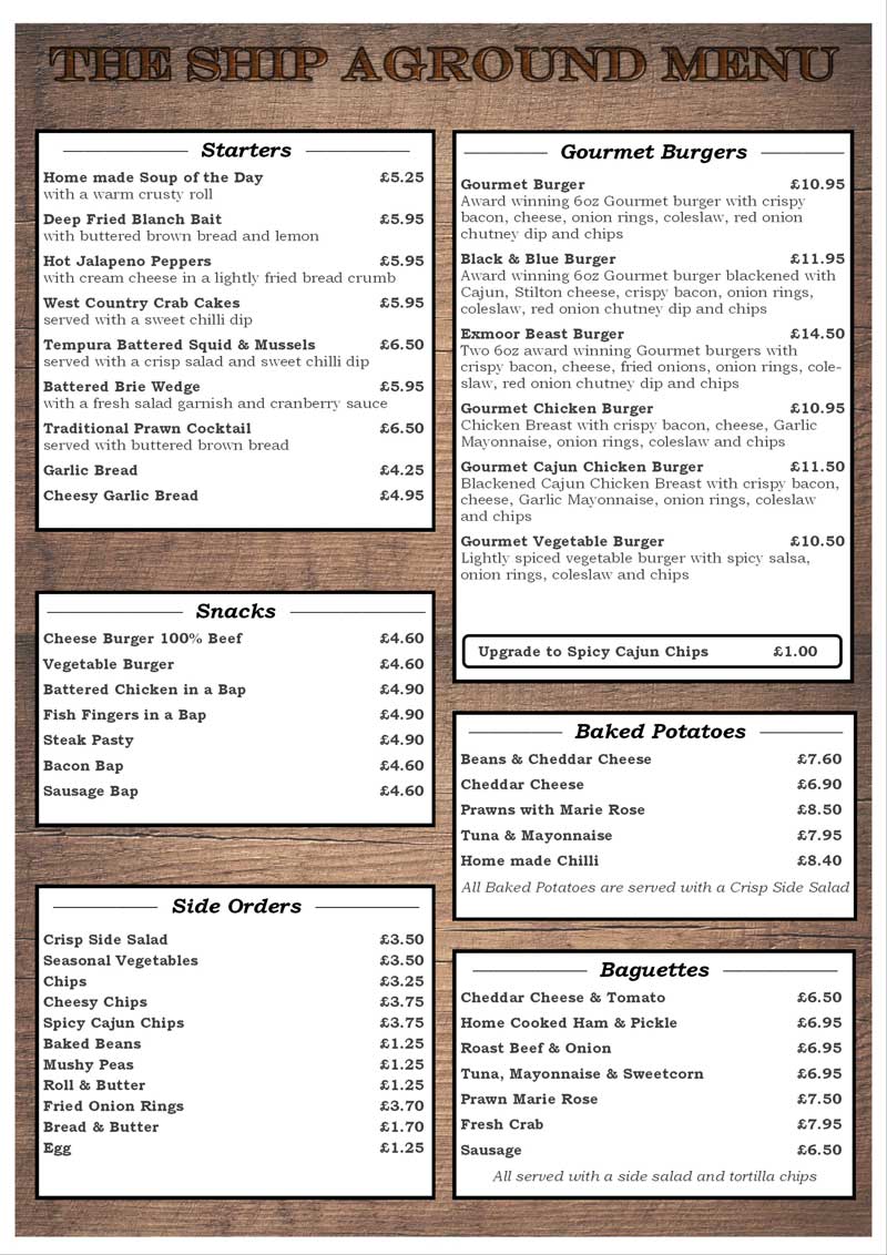 Food Menu Pub Restaurant in Mortehoe large bar food menu