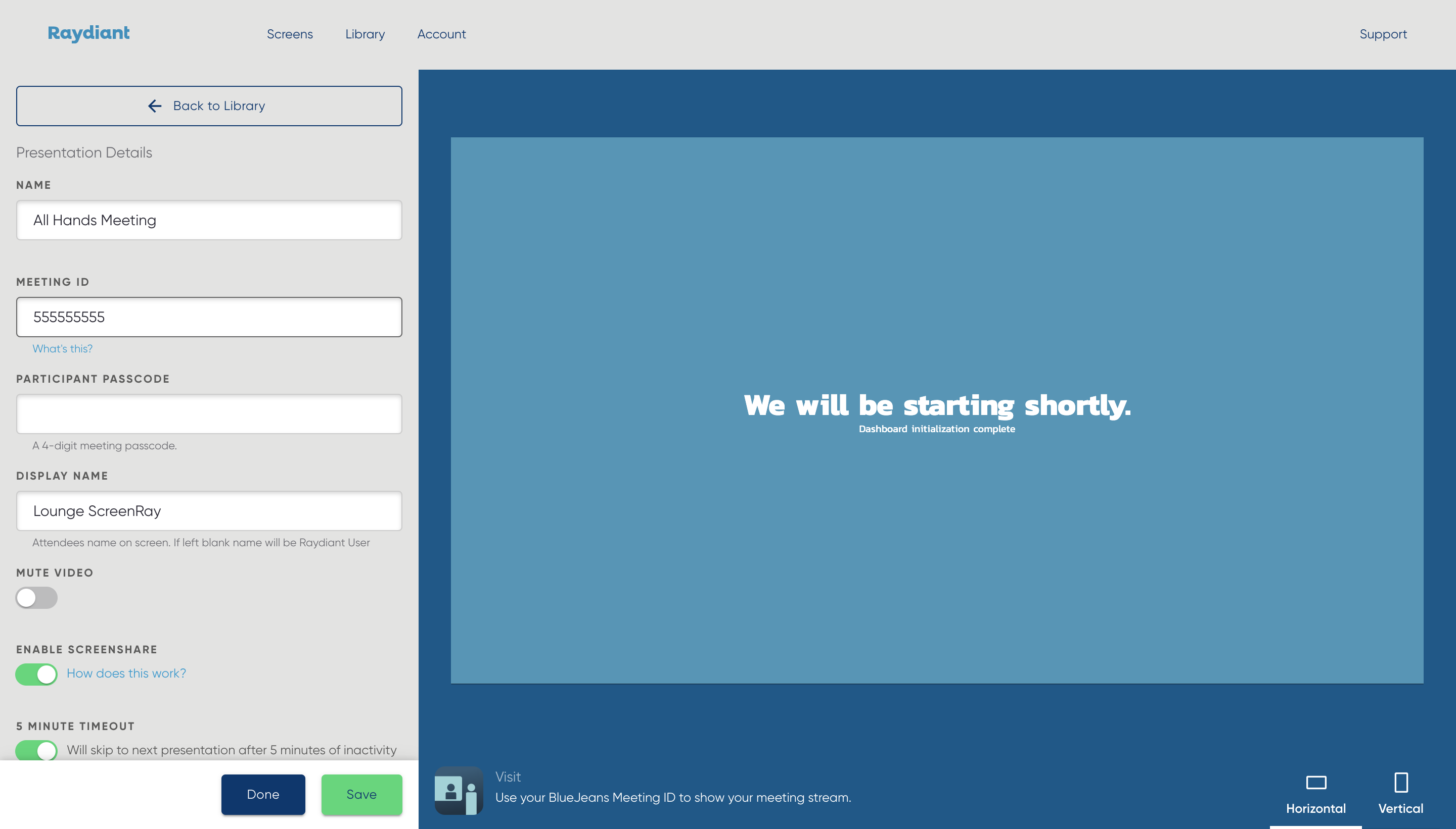 How do I put a BlueJeans meeting on my Raydiant screens?