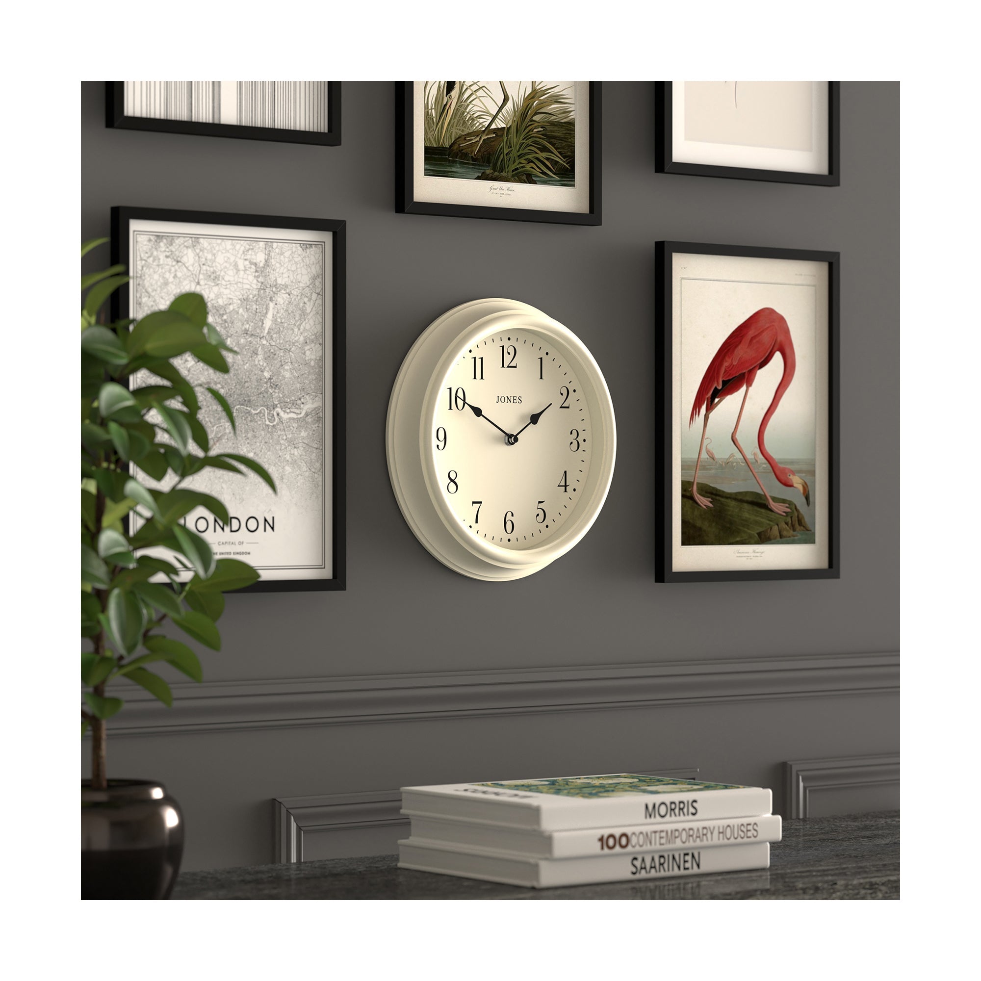 Jones wall clock in pale cream 30cm Jones Clocks Jones Clocks Venetian Wall Clock A classic wall clock with a decorative case finished in matt 'pepper' grey. Jones venetian wall clock in grey 30cm. A classic wall clock with a decorative case and traditional metal spade hands mark time behind a flat glass lens. Accurate and reliable quartz step movement with ticking noise. Where style and affordability come together. A classic wall clock with. Jones Clocks Venetian Wall Clock.