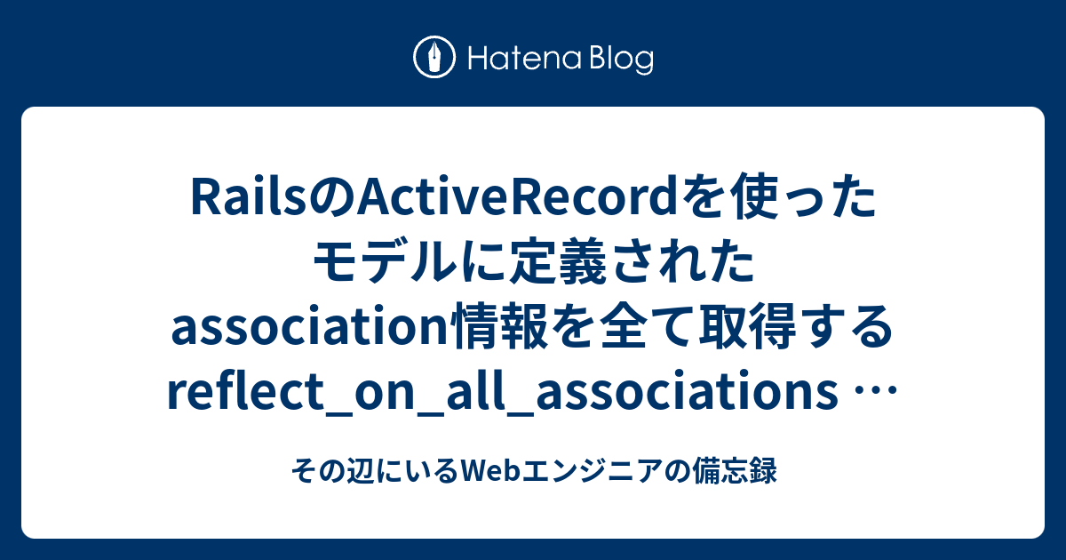 RailsのActiveRecordを使ったモデルに定義されたassociation情報を全て取得する reflect_on_all Rails Activerecord Associations Understand the various types of associations. Active record is a library that connects classes to relational database tables and provides a persistence layer for applications. Learn how to declare and use associations between active record models in rails. In rails, an association is a connection between two active record models. After reading this guide, you will know how to: This. Rails Activerecord Associations.