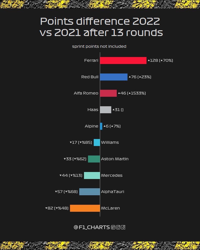 F1_charts on Twitter "F1 2022 vs 2021 points difference for teams 1⃣