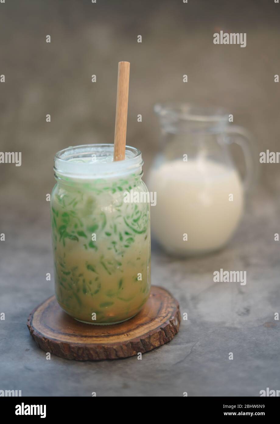 Es Cendol. Indonesian iced dessert of rice flour and pandanus jelly