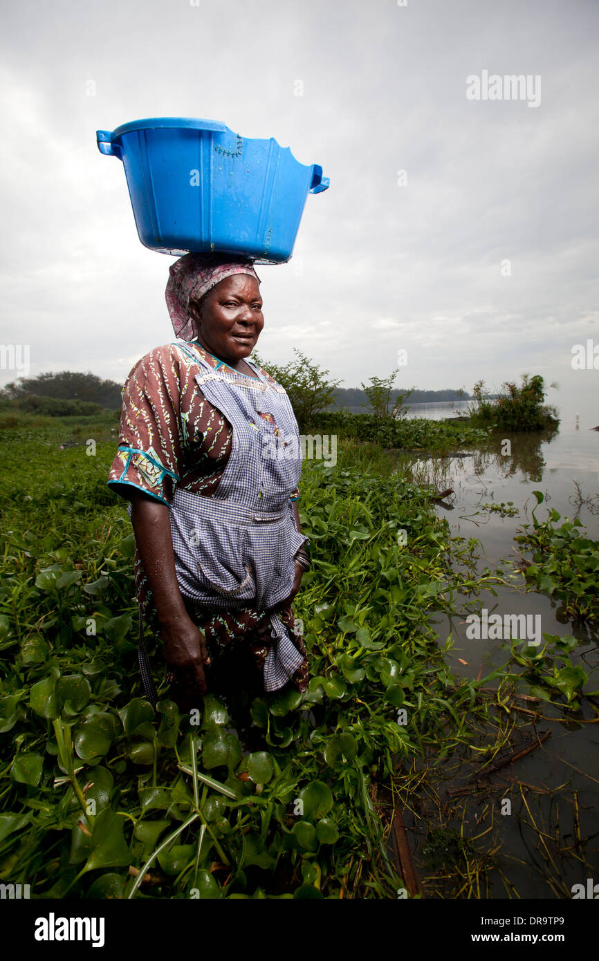 Woman balancing plastic bowl on head and wading through Water Hyacinth