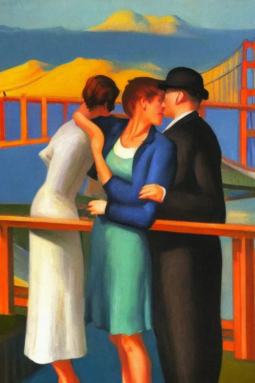 KREA edward hopper style!!! a lesbian couple!! romantic, mid century, golden gate bridge in