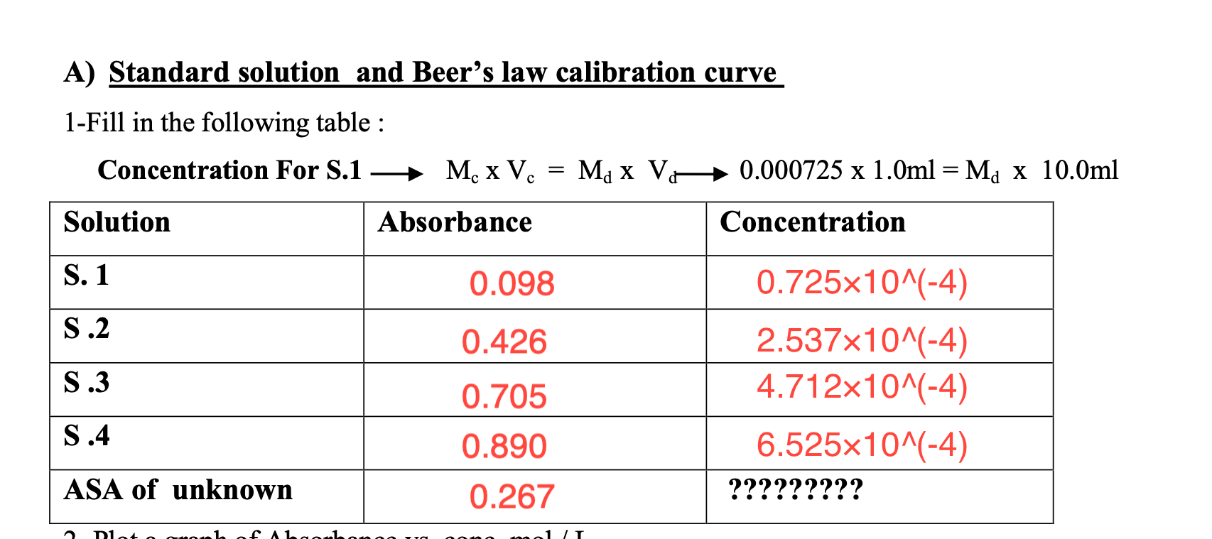 Solved A) Standard solution and Beer's law calibration curve